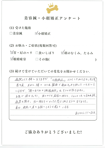 お陰で顔はスッキリ、周りからも表情が明るく、しゅっとしたと言われます。